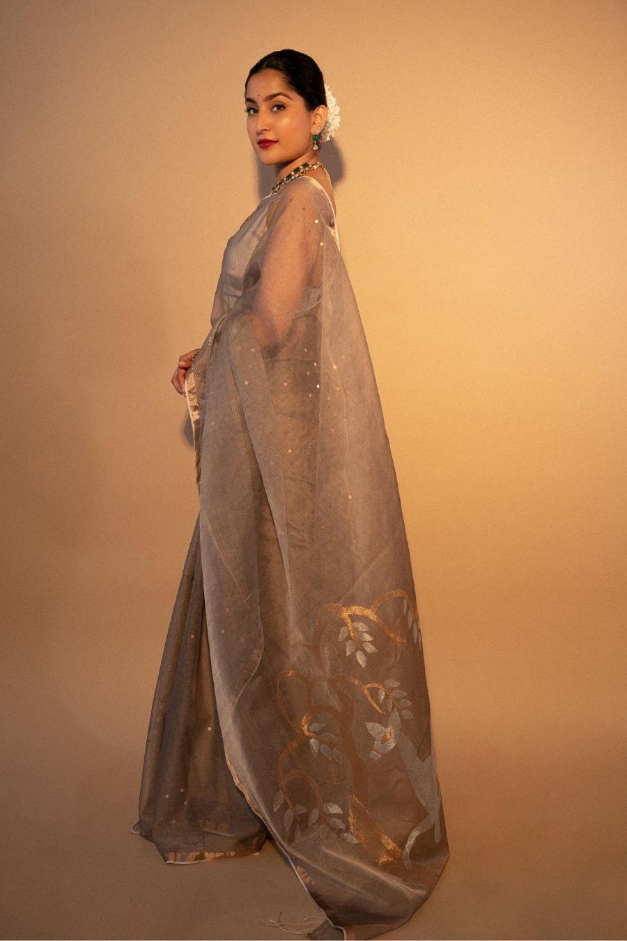 The tissue silk Jamdani saree with deers and trees woven on the pallu is a stunning representation of nature-inspired artistry. Made from lightweight tissue silk, this saree offers a delicate and graceful drape, making it perfect for special occasions.
