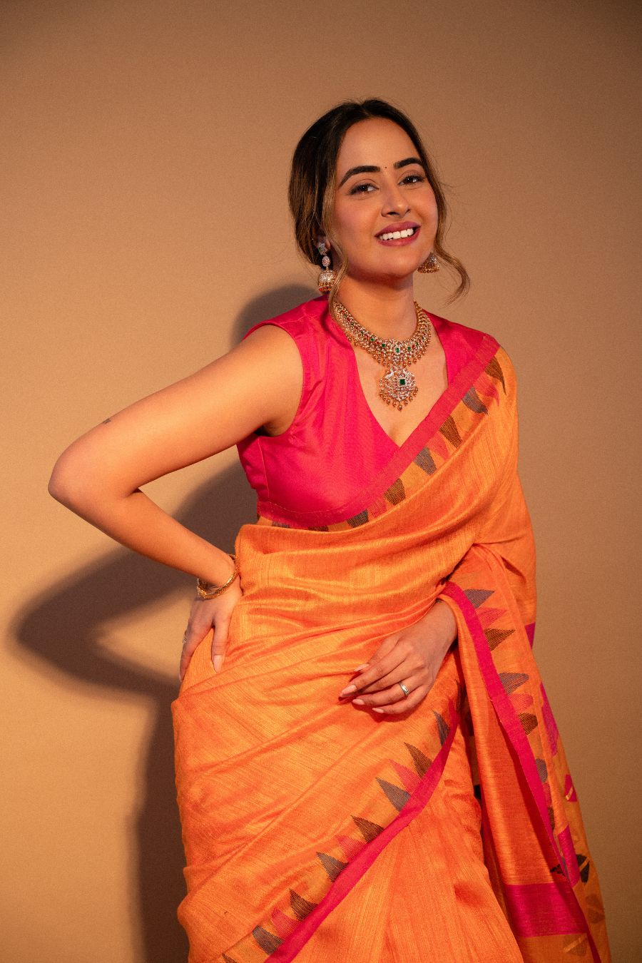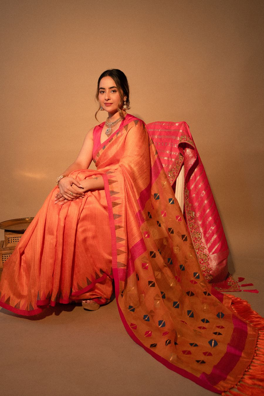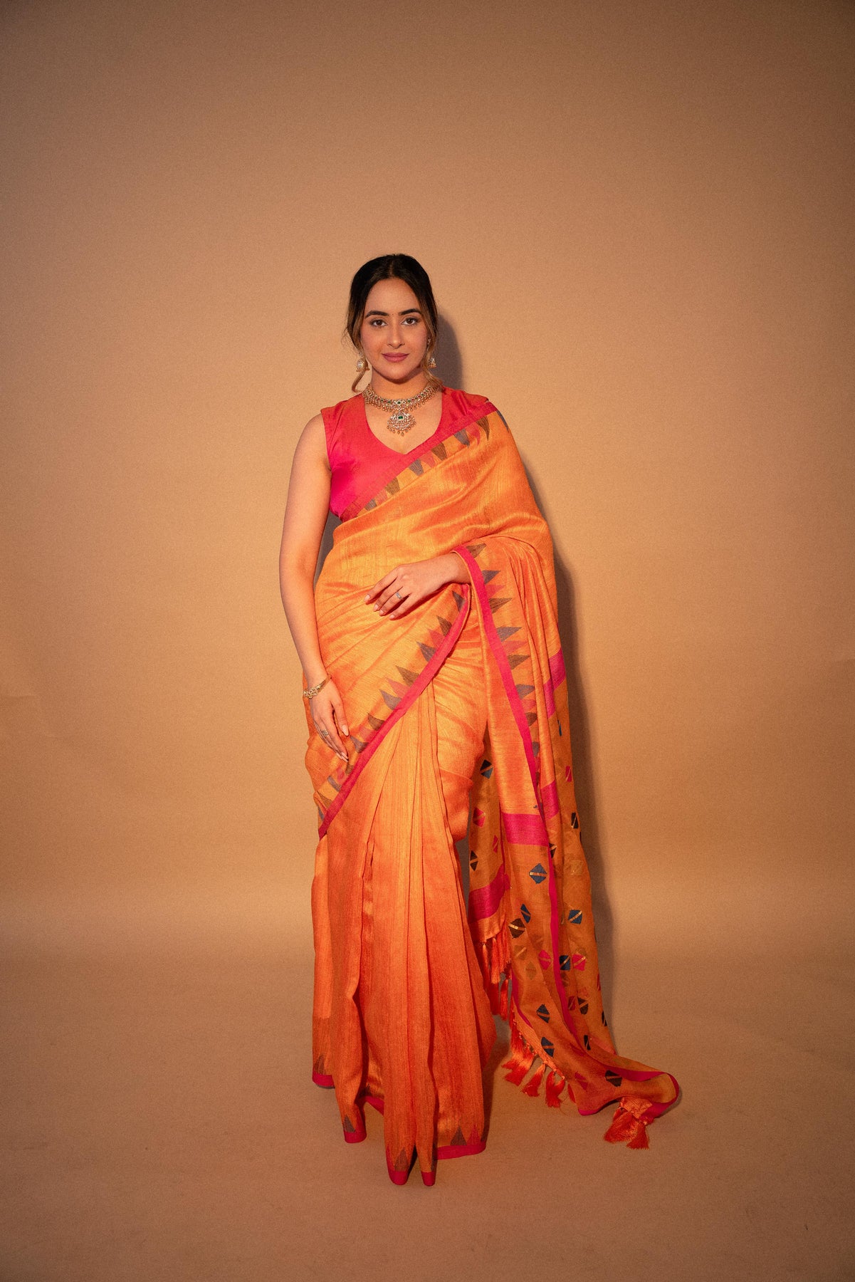 This exquisite orange matka silk Jamdani saree showcases the perfect blend of traditional craftsmanship and contemporary elegance. Crafted from high-quality matka silk, the saree features a slightly textured finish that adds depth and character to the fabric. The rich orange hue is vibrant and eye-catching, making it ideal for festive occasions and celebrations.
